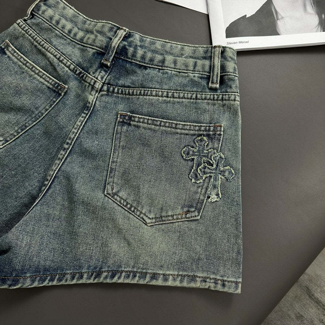 Cross patch embroidered vintage denim shorts